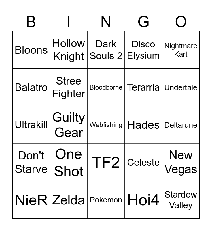 This bingo card has 25 words: One Shot, Pokemon, Bloodborne, NieR, Nightmare Kart, Bloons, Balatro, Hollow Knight, Hades, TF2, Terarria, Ultrakill, Celeste, New Vegas, Stree Fighter, Stardew Valley, Deltarune, Dark Souls 2, Undertale, Guilty Gear, Webfishing, Zelda, Don't Starve, Disco Elysium and Hoi4.