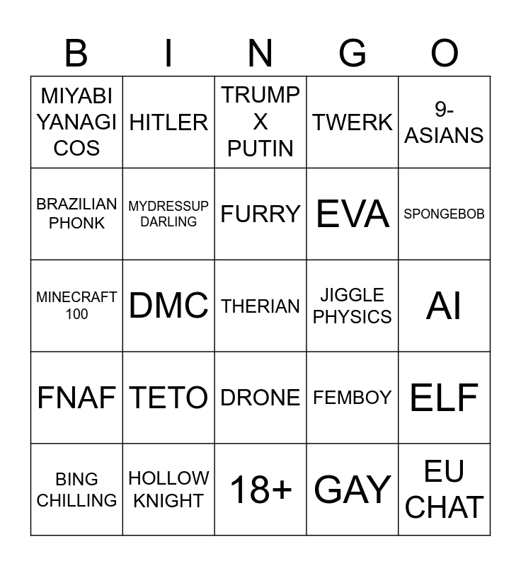 This bingo card has 25 words: TETO, 18+, FURRY, BING CHILLING, 9-ASIANS, MIYABI YANAGI COS, BRAZILIAN PHONK, HITLER, JIGGLE PHYSICS, DRONE, EVA, MINECRAFT 100, FEMBOY, ELF, MYDRESSUP DARLING, EU CHAT, AI, TRUMP X PUTIN, SPONGEBOB, DMC, THERIAN, HOLLOW KNIGHT, FNAF, TWERK and GAY.