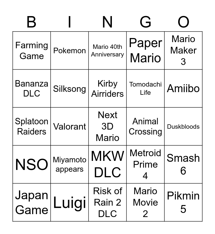 This bingo card has a free space and 24 words: Miyamoto appears, Luigi, Kirby Airriders, Japan Game, Mario Maker 3, Farming Game, Bananza DLC, Pokemon, Animal Crossing, MKW DLC, Tomodachi Life, Splatoon Raiders, Metroid Prime 4, Smash 6, Silksong, Mario Movie 2, Duskbloods, Mario 40th Anniversary, Amiibo, Valorant, Pikmin 5, NSO, Paper Mario and Risk of Rain 2 DLC.