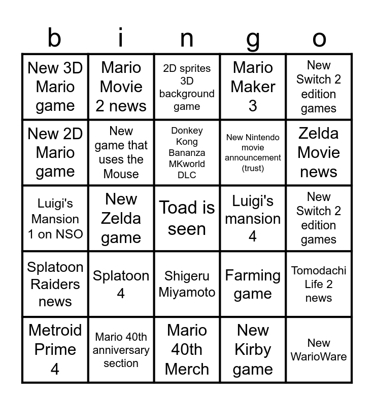 This bingo card has a free space and 24 words: Splatoon 4, Mario 40th anniversary section, Donkey Kong Bananza MKworld DLC, Metroid Prime 4, New Switch 2 edition games, New 3D Mario game, New 2D Mario game, Mario Movie 2 news, Luigi's mansion 4, Shigeru Miyamoto, New Nintendo movie announcement (trust), Luigi's Mansion 1 on NSO, Farming game, Tomodachi Life 2 news, New game that uses the Mouse, New Kirby game, New Switch 2 edition games, 2D sprites 3D background game, Zelda Movie news, New Zelda game, New WarioWare, Splatoon Raiders news, Mario Maker 3 and Mario 40th Merch.