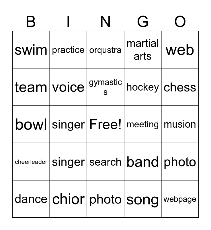 This bingo card has a free space and 24 words: singer, chior, gymastic s, dance, web, swim, team, practice, meeting, search, hockey, bowl, band, photo, voice, song, musion, orqustra, chess, singer, webpage, cheerleader, martial arts and photo.