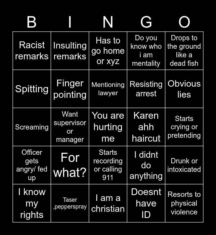 This bingo card has a free space and 24 words: For what?, Taser ,pepperspray, Mentioning lawyer, I know my rights, Drops to the ground like a dead fish, Racist remarks, Spitting, Insulting remarks, Karen ahh haircut, Starts recording or calling 911, Resisting arrest, Screaming, I didnt do anything, Drunk or intoxicated, Finger pointing, Doesnt have ID, Starts crying or pretending, Has to go home or xyz, Obvious lies, Want supervisor or manager, Resorts to physical violence, Officer gets angry/ fed up, Do you know who i am mentality and I am a christian.
