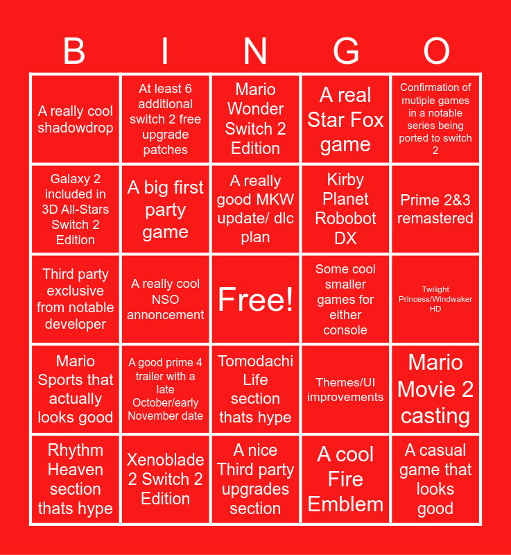 This bingo card has a free space and 24 words: A good prime 4 trailer with a late October/early November date, Xenoblade 2 Switch 2 Edition, A really good MKW update/ dlc plan, Rhythm Heaven section thats hype, Confirmation of mutiple games in a notable series being ported to switch 2, A really cool shadowdrop, Galaxy 2 included in 3D All-Stars Switch 2 Edition, At least 6 additional switch 2 free upgrade patches, Some cool smaller games for either console, Tomodachi Life section thats hype, Kirby Planet Robobot DX, Third party exclusive from notable developer, Themes/UI improvements, Mario Movie 2 casting, A big first party game, A cool Fire Emblem, Twilight Princess/Windwaker HD, Mario Wonder Switch 2 Edition, Prime 2&3 remastered, A really cool NSO annoncement, A casual game that looks good, Mario Sports that actually looks good, A real Star Fox game and A nice Third party upgrades section.