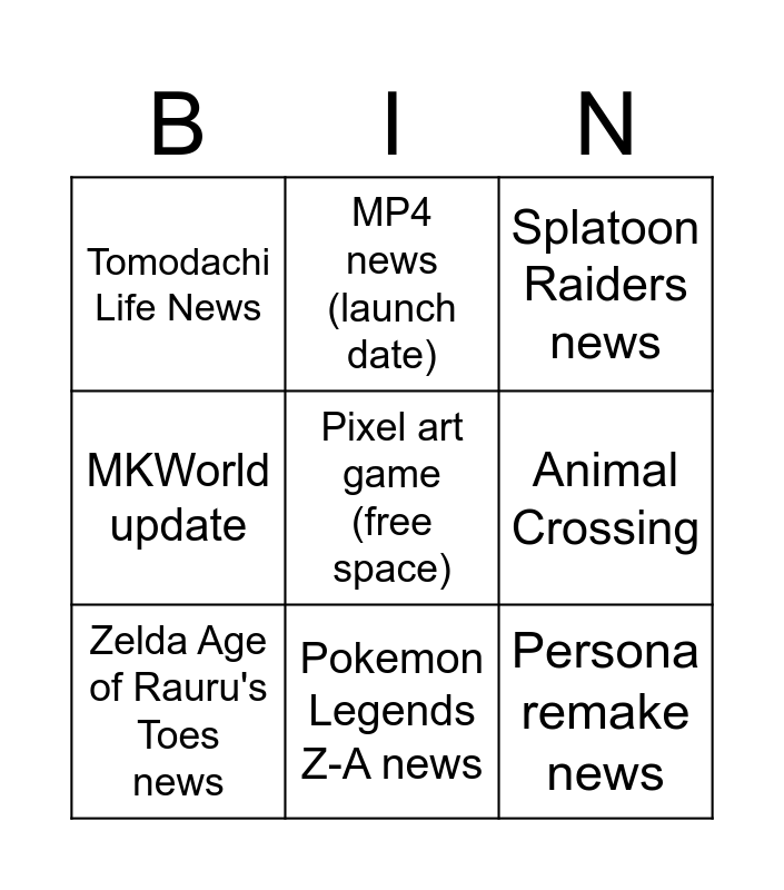 This bingo card has a free space and 8 words: Animal Crossing, Splatoon Raiders news, MP4 news (launch date), Zelda Age of Rauru's Toes news, Tomodachi Life News, Persona remake news, MKWorld update and Pokemon Legends Z-A news.
