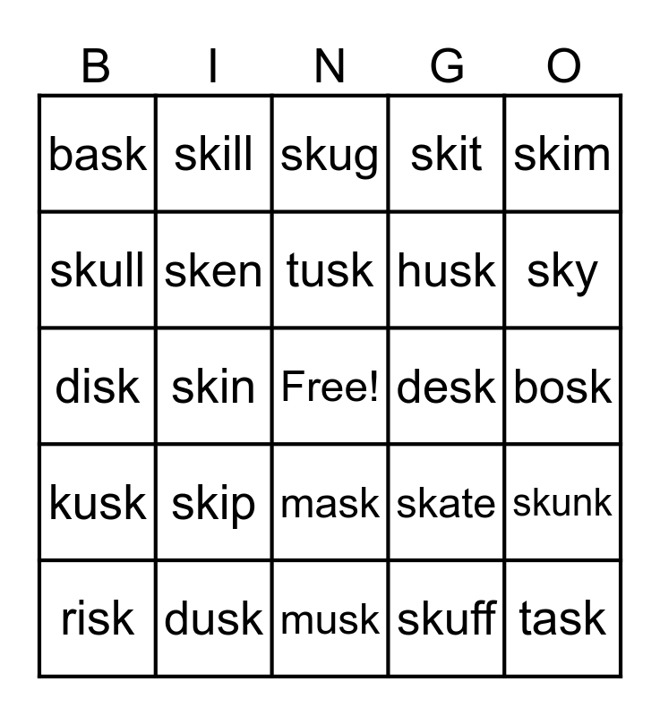This bingo card has a free space and 24 words: skip, dusk, tusk, risk, skim, bask, skull, skill, desk, mask, husk, disk, skate, skunk, sken, skuff, bosk, skug, sky, skin, task, kusk, skit and musk.