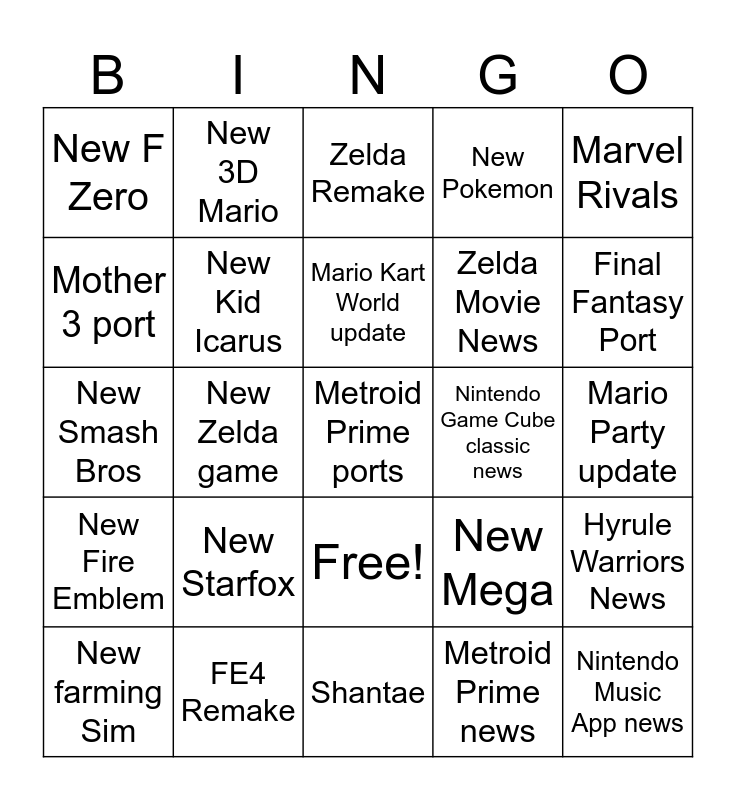 This bingo card has 26 words: Free!, Metroid Prime news, Mario Kart World update, FE4 Remake, Marvel Rivals, New F Zero, Mother 3 port, New 3D Mario, Mario Party update, New Mega, Zelda Movie News, New Smash Bros, Hyrule Warriors News, New farming Sim, New Zelda game, Duskbloods news, New Pokemon, New Fire Emblem, Zelda Remake, Metroid Prime ports, Final Fantasy Port, Shantae, Nintendo Game Cube classic news, New Starfox, New Kid Icarus and Nintendo Music App news.