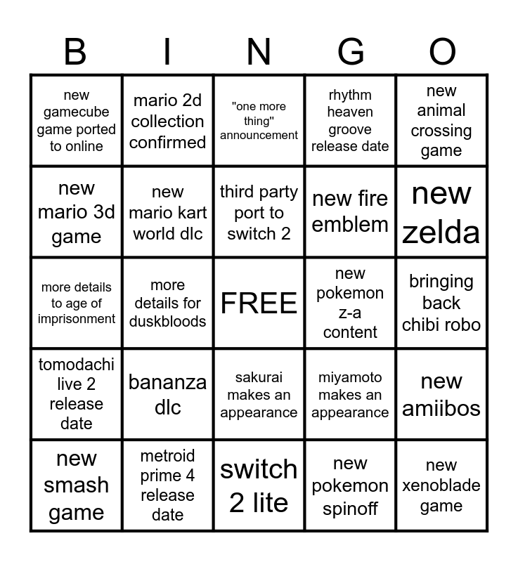 This bingo card has a free space and 24 words: bananza dlc, metroid prime 4 release date, third party port to switch 2, new smash game, new animal crossing game, new gamecube game ported to online, new mario 3d game, mario 2d collection confirmed, new pokemon z-a content, sakurai makes an appearance, new fire emblem, more details to age of imprisonment, miyamoto makes an appearance, new amiibos, new mario kart world dlc, new pokemon spinoff, bringing back chibi robo, ''one more thing'' announcement, new zelda, more details for duskbloods, new xenoblade game, tomodachi live 2 release date, rhythm heaven groove release date and switch 2 lite.