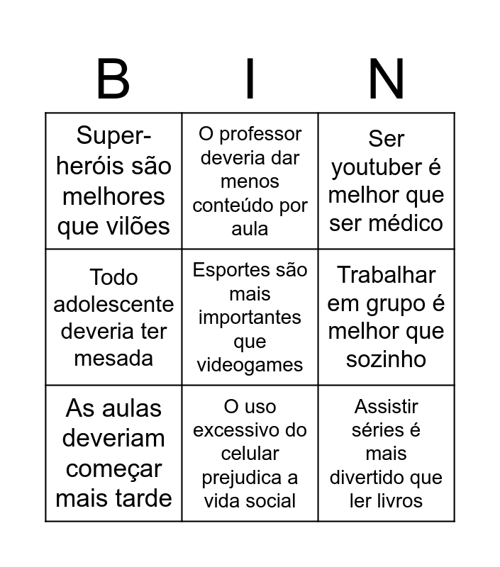 This bingo card has 40 words: O recreio deveria ser mais longo, As provas deveriam ser substituídas por trabalhos, Celular deveria ser permitido em sala, As aulas deveriam começar mais tarde, A lição de casa deveria ser proibida, Jogos online ajudam no raciocínio, O uso excessivo do celular prejudica a vida social, Ler livros é melhor do que assistir filmes, Esportes são mais importantes que videogames, Dormir cedo melhora o rendimento escolar, Animais de estimação ajudam no bem-estar, Todo adolescente deveria ter mesada, Reciclagem deveria ser obrigatória, A internet deveria ser um direito básico, Comprar online é melhor que em lojas físicas, Brigadeiro é melhor que pizza, As férias deveriam durar 3 meses, Super-heróis são melhores que vilões, Cachorro é melhor do que gato, Ser youtuber é melhor que ser médico, As aulas de artes deveriam ser obrigatórias, Deveria haver mais passeios escolares, Assistir séries é mais divertido que ler livros, Trabalhar em grupo é melhor que sozinho, O lanche da escola deveria ser escolhido pelos alunos, Música ajuda a estudar, Videogames violentos incentivam agressividade, Deveria haver dois recreios por turno, Aprender inglês é mais importante que espanhol, Deveria ter aulas de culinária na escola, Redes sociais atrapalham os estudos, Todo mundo deveria aprender a tocar um instrumento, Filmes baseados em livros são melhores que os originais, Matemática é mais importante que português, Os alunos deveriam escolher algumas disciplinas, A escola deveria liberar o uso de uniforme, Estudar online é melhor que presencial, Deveria haver mais esportes na escola, O professor deveria dar menos conteúdo por aula and A merenda escolar deveria ser opcional.