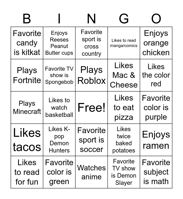 This bingo card has a free space and 24 words: Likes K-pop Demon Hunters, Favorite color is green, Plays Roblox, Likes to read for fun, Enjoys orange chicken, Favorite candy is kitkat, Plays Fortnite, Enjoys Reeses Peanut Butter cups, Likes to eat pizza, Favorite sport is soccer, Likes Mac & Cheese, Plays Minecraft, Likes twice baked potatoes, Enjoys ramen, Favorite TV show is Spongebob, Favorite TV show is Demon Slayer, Favorite color is purple, Favorite sport is cross country, Likes the color red, Likes to watch basketball, Favorite subject is math, Likes tacos, Likes to read manga/comics and Watches anime.