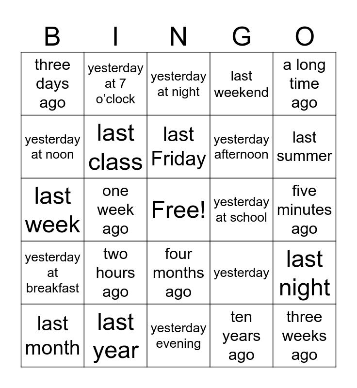 This bingo card has a free space and 27 words: yesterday, yesterday morning, yesterday afternoon, yesterday evening, yesterday at noon, yesterday at night, yesterday at 7 o’clock, yesterday at breakfast, yesterday at school, last night, last week, last weekend, last month, last year, last summer, last winter, last class, last Friday, two hours ago, three days ago, five minutes ago, ten years ago, one week ago, three weeks ago, four months ago, a long time ago and an hour ago.