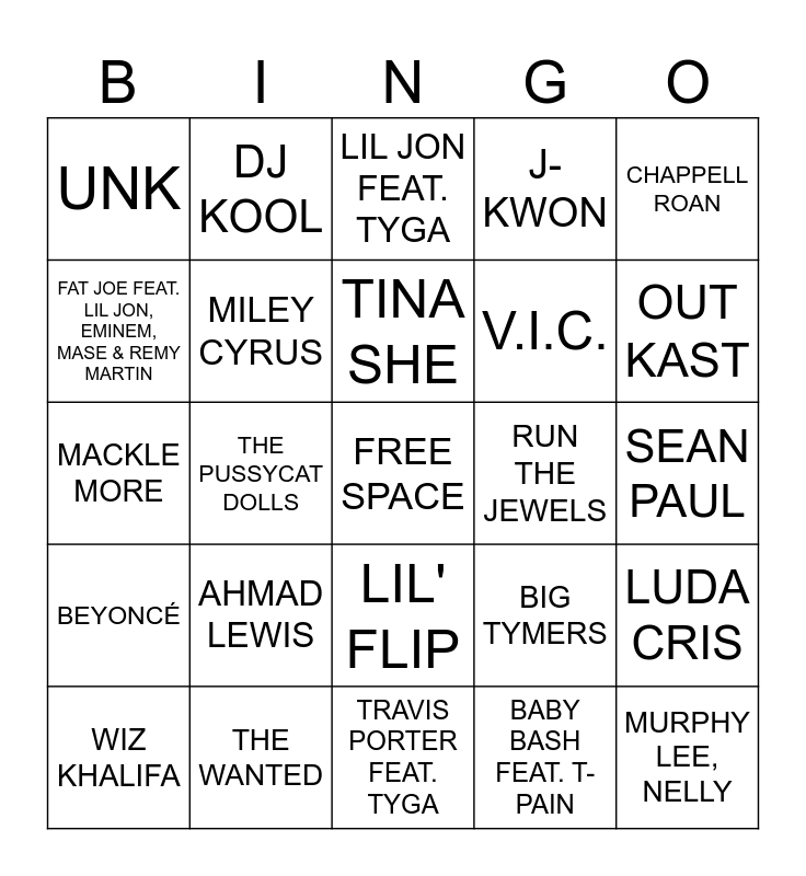This bingo card has a free space and 40 words: PITBULL FEAT. CHRISTINA AGUILERA, MACKLE MORE, GYM CLASS HEROES FEAT. ADAM LEVINE, MILEY CYRUS, THE WANTED, LIL' FLIP, TINA SHE, LA ROUX, CHAPPELL ROAN, BEYONCÉ, THE PUSSYCAT DOLLS, J-KWON, MURPHY LEE, NELLY, SEAN PAUL, RUN THE JEWELS, AHMAD LEWIS, YING YANG TWINS, UNK, CHINGY, LIL JON FEAT. TYGA, LUDA CRIS, BABY BASH FEAT. T-PAIN, V.I.C., FAT JOE FEAT. LIL JON, EMINEM, MASE & REMY MARTIN, T.I., LLOYD BANKS, LIL WAYNE, METHOD MAN, REDMAN, CAM'RON, AKON, SOULJA BOY, WIZ KHALIFA, 50 CENT, BIG TYMERS, OUT KAST, TRAVIS PORTER FEAT. TYGA, SHOP BOYZ, MISSY ELLIOTT, DJ KOOL and POST MALONE.