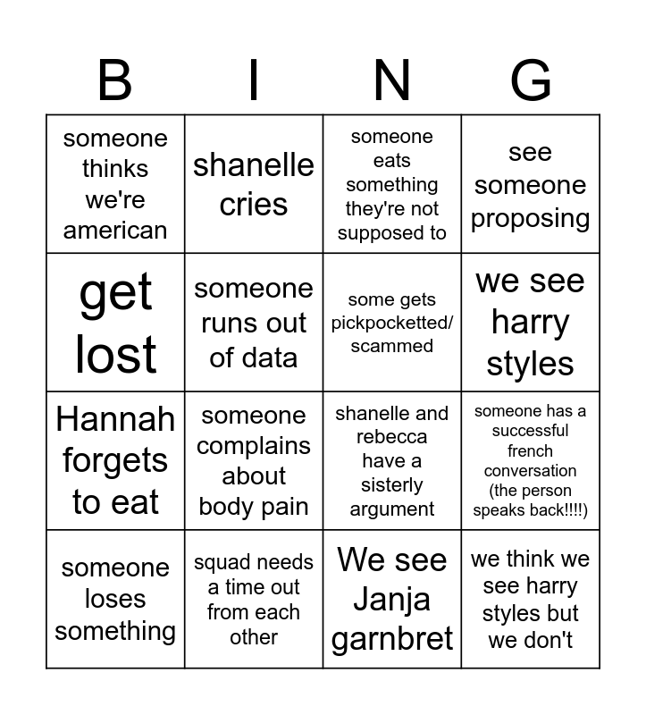 This bingo card has 16 words: someone loses something, squad needs a time out from each other, someone eats something they're not supposed to, see someone proposing, get lost, shanelle cries, shanelle and rebecca have a sisterly argument, someone has a successful french conversation (the person speaks back!!!!), someone thinks we're american, someone runs out of data, We see Janja garnbret, we see harry styles, Hannah forgets to eat, someone complains about body pain, some gets pickpocketted/ scammed and we think we see harry styles but we don't.