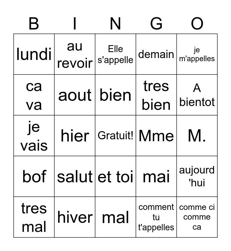 This bingo card has a free space and 24 words: salut, hiver, bien, tres mal, je m'appelles, lundi, ca va, au revoir, Mme, et toi, tres bien, je vais, mai, aujourd 'hui, aout, comment tu t'appelles, M., Elle s'appelle, A bientot, hier, comme ci comme ca, bof, demain and mal.