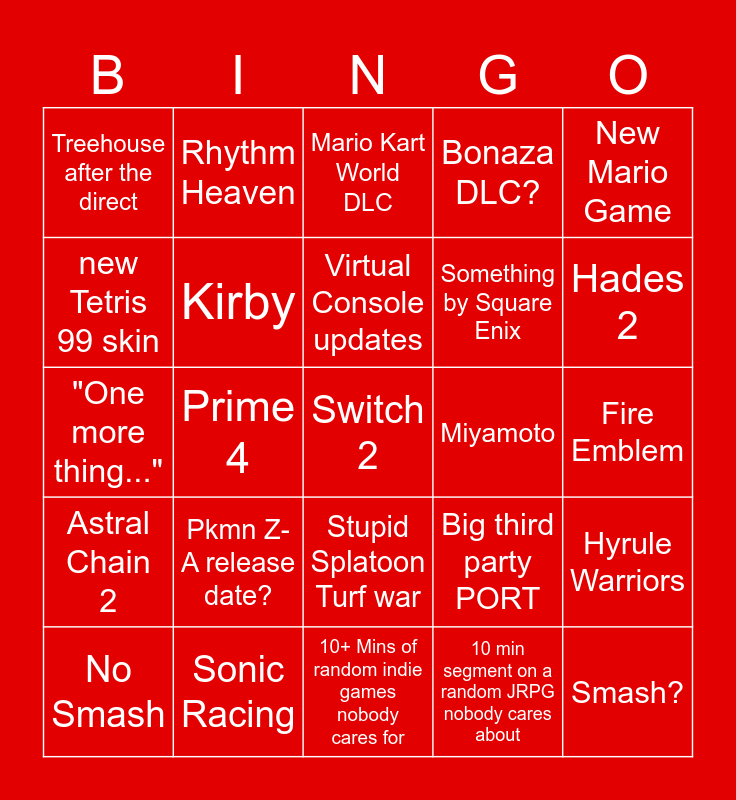 This bingo card has a free space and 24 words: No Smash, Pkmn Z-A release date?, Virtual Console updates, 10 min segment on a random JRPG nobody cares about, New Mario Game, Treehouse after the direct, Rhythm Heaven, Mario Kart World DLC, Miyamoto, Fire Emblem, "One more thing...", Kirby, Big third party PORT, Hyrule Warriors, new Tetris 99 skin, Sonic Racing, 10+ Mins of random indie games nobody cares for, Bonaza DLC?, Hades 2, Astral Chain 2, Prime 4, Stupid Splatoon Turf war, Something by Square Enix and Smash?.