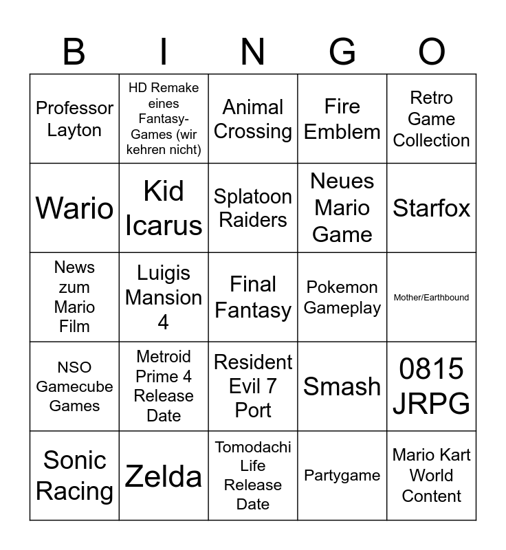 This bingo card has a free space and 24 words: Metroid Prime 4 Release Date, Zelda, Splatoon Raiders, Sonic Racing, Retro Game Collection, Professor Layton, Wario, HD Remake eines Fantasy-Games (wir kehren nicht), Pokemon Gameplay, Resident Evil 7 Port, Neues Mario Game, News zum Mario Film, Smash, 0815 JRPG, Kid Icarus, Partygame, Mother/Earthbound, Animal Crossing, Starfox, Luigis Mansion 4, Mario Kart World Content, NSO Gamecube Games, Fire Emblem and Tomodachi Life Release Date.