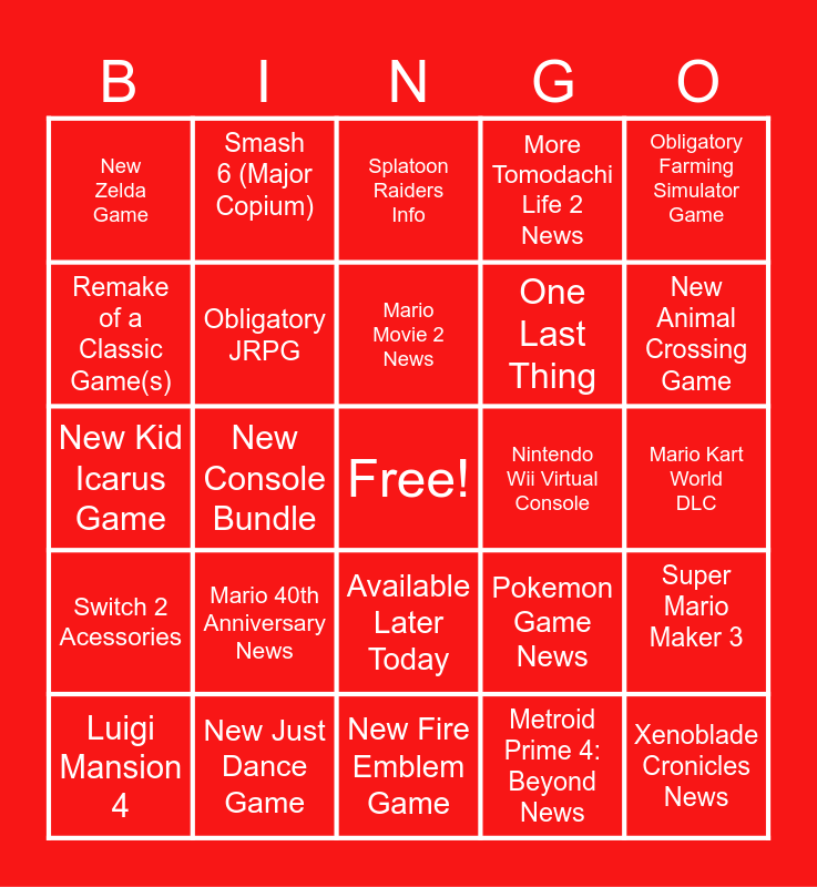 This bingo card has a free space and 24 words: Luigi Mansion 4, Mario 40th Anniversary News, Mario Movie 2 News, Metroid Prime 4: Beyond News, Obligatory Farming Simulator Game, New Zelda Game, Smash 6 (Major Copium), Splatoon Raiders Info, Nintendo Wii Virtual Console, Mario Kart World DLC, New Kid Icarus Game, Obligatory JRPG, Pokemon Game News, Super Mario Maker 3, Remake of a Classic Game(s), New Just Dance Game, New Fire Emblem Game, More Tomodachi Life 2 News, New Animal Crossing Game, Switch 2 Acessories, New Console Bundle, Available Later Today, One Last Thing and Xenoblade Cronicles News.