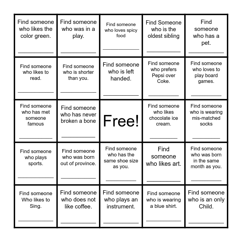 This bingo card has a free space and 25 words: Find someone who was born out of province. ____________, Find someone who plays an instrument. ___________, Find someone who is left handed. ___________, Find someone Who likes to Sing. ____________, Find someone who has a pet. ___________, Find someone who likes the color green. ___________, Find someone who likes to read. _____________, Find someone who was in a play. ___________, Find someone who likes chocolate ice cream. __________, Find someone who has the same shoe size as you. ___________, Find someone who prefers Pepsi over Coke. ___________, Find someone who has met someone famous ____________, Find someone who likes art. __________, Find someone who was born in the same month as you. ___________, Find someone who is shorter than you. _____________, Find someone who has the same middle initial as you. ___________, Find someone who is wearing mis-matched socks __________, Find someone who loves spicy food ______________, Find someone who loves to play board games. ___________, Find someone who has never broken a bone ___________, Find someone who is an only Child. ___________, Find someone who does not like coffee. ___________, Find someone who plays sports. _____________, Find Someone who is the oldest sibling ___________ and Find someone who is wearing a blue shirt. ____________.