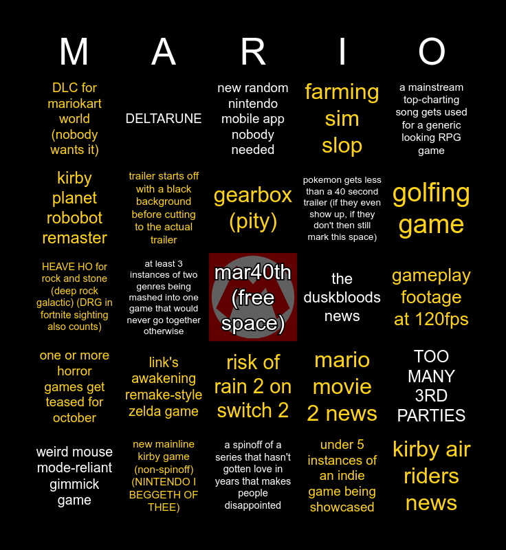 This bingo card has a free space and 49 words: people spam the live chat with "3d mario", kirby air riders news, metroid prime 4 trailer frontloaded in the direct (first 5 showcases), a spinoff of a series that hasn't gotten love in years that makes people disappointed, link's awakening remake-style zelda game, live chat complains about the new hyrule warriors game, DELTARUNE, no rhythm heaven groove news, kirby planet robobot remaster, sakurai shows up & still looks immortal, trailer starts off with a black background before cutting to the actual trailer, farming sim slop, TOO MANY 3RD PARTIES, mario movie 2 news, animated bowser shows up outside of a trailer (unless he shows up in the mario movie 2 trailer), no zelda movie news (it will never release), gearbox (pity), the duskbloods news, new game & watch console (why is nintendo still making those), a mainstream top-charting song gets used for a generic looking RPG game, at least 3 instances of two genres being mashed into one game that would never go together otherwise, under 5 instances of an indie game being showcased, DLC for mariokart world (nobody wants it), pokemon gets less than a 40 second trailer (if they even show up, if they don't then still mark this space), nintendo drops obscure mario spinoff, golfing game, weird mouse mode-reliant gimmick game, at least 3 first person shooters, risk of rain 2 on switch 2, one or more horror games get teased for october, metroid prime 4 releases in october, nintendo shadow drops an obscure non-game item that nobody asked for (apps count), they change their decision on the virtual gamecard system (PLEASE NINTENDO PLEASE), a crazy reveal happens in one of those randomass highlight reels stuffed full with tons of games, new mainline kirby game (non-spinoff) (NINTENDO I BEGGETH OF THEE), at least 2 trailers for an "HD-2D Remake" (you know the ones), a bethesda game w/ higher graphical fidelity gets announced for the switch 2, doom dark ages for nintendo switch 2, gameplay footage at 120fps, new random switch 2 accessory, something something tetris something something, something FZERO related, RE7+8 for switch 2, ubislop, HEAVE HO for rock and stone (deep rock galactic) (DRG in fortnite sighting also counts), new random nintendo mobile app nobody needed, new "switch 2 edition" of an existing nintendo game, splatoon raiders and "oh, and one more thing" (roughly).