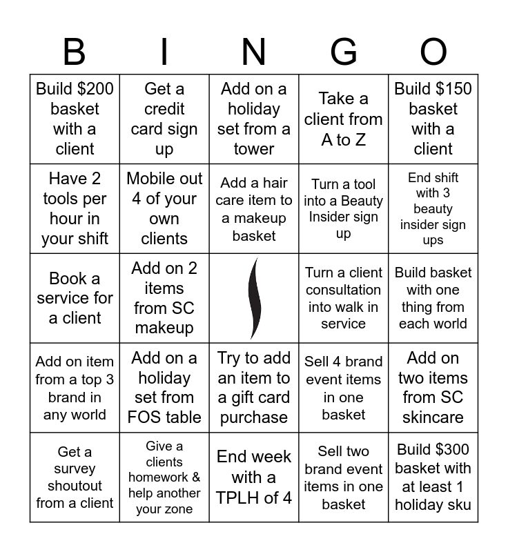 This bingo card has a free space and 24 words: Add on a holiday set from FOS table, Give a clients homework & help another your zone, Add a hair care item to a makeup basket, Get a survey shoutout from a client, Build $150 basket with a client, Build $200 basket with a client, Have 2 tools per hour in your shift, Get a credit card sign up, Turn a client consultation into walk in service, Try to add an item to a gift card purchase, Turn a tool into a Beauty Insider sign up, Book a service for a client, Sell 4 brand event items in one basket, Add on two items from SC skincare, Mobile out 4 of your own clients, Sell two brand event items in one basket, Build basket with one thing from each world, Add on a holiday set from a tower, End shift with 3 beauty insider sign ups, Add on 2 items from SC makeup, Build $300 basket with at least 1 holiday sku, Add on item from a top 3 brand in any world, Take a client from A to Z and End week with a TPLH of 4.
