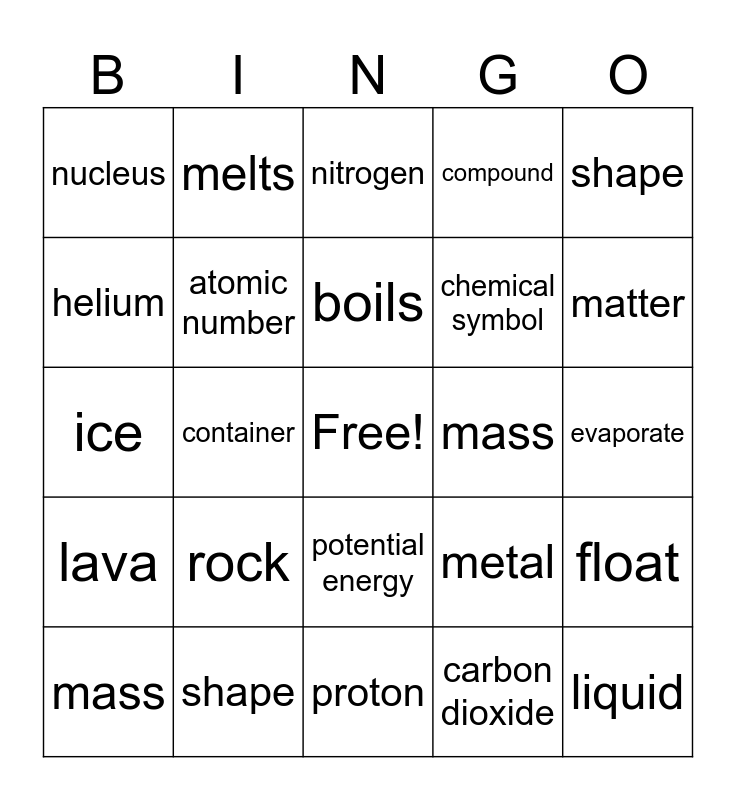 This bingo card has a free space and 55 words: element, mass, neutron, nucleus, proton, atom, atomic number, chemical change, chemical symbol, chemistry, compound, electron, solids, gases, liquids, mass, shape, container, lava, liquid, mass, melts, metal, nitrogen, atoms, boils, carbon dioxide, condense, evaporate, float, freezes, gas, gasoline, hail, helium, ice, iron, lava, liquid, mass, melts, metal, nitrogen, oxygen, rock, shape, solid, water, water vapor, matter, momentum, physical change, physics, potential energy and volume.