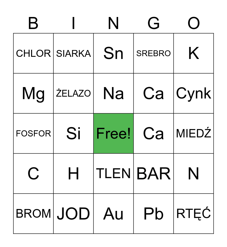 This bingo card has a free space and 24 words: H, JOD, Na, BROM, K, CHLOR, Mg, SIARKA, Ca, TLEN, Ca, FOSFOR, BAR, N, ŻELAZO, Pb, MIEDŹ, Sn, Cynk, Si, RTĘĆ, C, SREBRO and Au.
