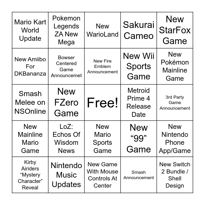 This bingo card has a free space and 24 words: LoZ: Echos Of Wisdom News, Nintendo Music Updates, New Fire Emblem Announcement, Kirby Airiders “Mystery Character” Reveal, New StarFox Game, Mario Kart World Update, New Amiibo For DKBananza, Pokemon Legends ZA New Mega, Metroid Prime 4 Release Date, New Mario Sports Game, New Wii Sports Game, Smash Melee on NSOnline, New “99” Game, New Nintendo Phone App/Game, Bowser Centered Game Announcemet, Smash Announcement, 3rd Party Game Announcement, New WarioLand, New Pokémon Mainline Game, New FZero Game, New Switch 2 Bundle / Shell Design, New Mainline Mario Game, Sakurai Cameo and New Game With Mouse Controls At Center.