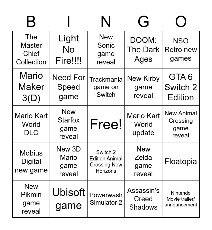 This bingo card has a free space and 24 words: New 3D Mario game reveal, Ubisoft game, Trackmania game on Switch, New Pikmin game reveal, NSO Retro new games, The Master Chief Collection, Mario Maker 3(D), Light No Fire!!!!, Mario Kart World update, Switch 2 Edition Animal Crossing New Horizons, New Kirby game reveal, Mario Kart World DLC, New Zelda game reveal, Floatopia, Need For Speed game, Assassin's Creed Shadows, New Animal Crossing game reveal, New Sonic game reveal, GTA 6 Switch 2 Edition, New Starfox game reveal, Nintendo Movie trailer/ announcement, Mobius Digital new game, DOOM: The Dark Ages and Powerwash Simulator 2.