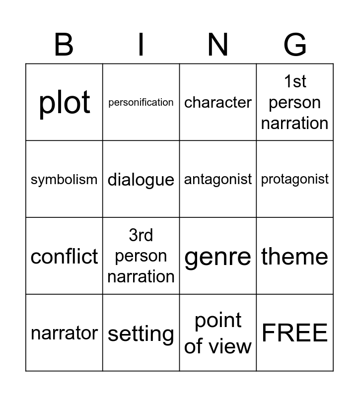 This bingo card has 16 words: setting, theme, character, plot, conflict, personification, genre, point of view, symbolism, dialogue, narrator, 1st person narration, 3rd person narration, protagonist, antagonist and FREE.