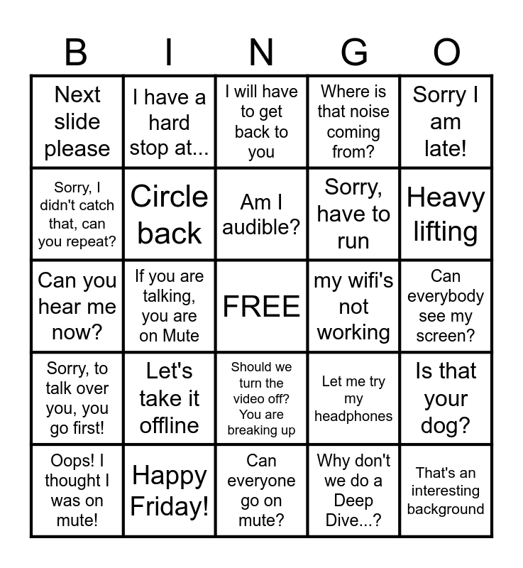 This bingo card has a free space and 24 words: Oops! I thought I was on mute!, Let's take it offline, Am I audible?, Why don't we do a Deep Dive...?, Sorry I am late!, Next slide please, I have a hard stop at..., I will have to get back to you, my wifi's not working, Can everybody see my screen?, Can you hear me now?, Circle back, Let me try my headphones, Is that your dog?, Sorry, I didn't catch that, can you repeat?, Happy Friday!, Can everyone go on mute?, Where is that noise coming from?, Heavy lifting, Sorry, to talk over you, you go first!, If you are talking, you are on Mute, Should we turn the video off? You are breaking up, Sorry, have to run and That's an interesting background.