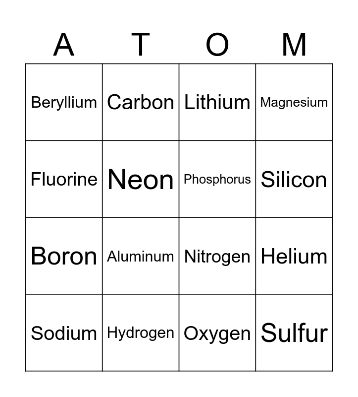 This bingo card has 16 words: Hydrogen, Helium, Lithium, Beryllium, Boron, Carbon, Nitrogen, Oxygen, Fluorine, Neon, Sodium, Magnesium, Aluminum, Silicon, Phosphorus and Sulfur.