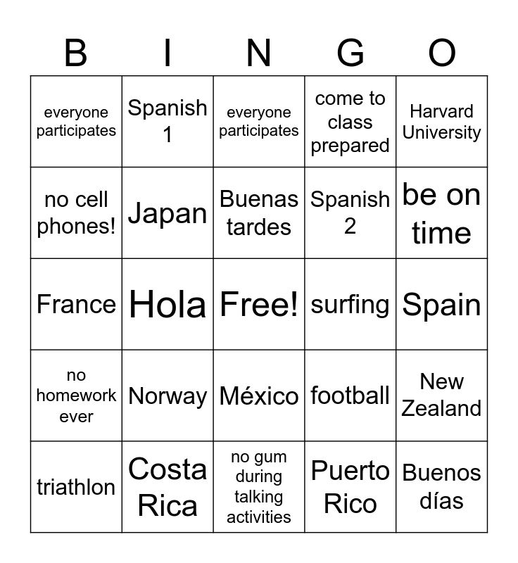 This bingo card has a free space and 24 words: Norway, Costa Rica, Buenas tardes, triathlon, Harvard University, everyone participates, no cell phones!, Spanish 1, surfing, México, Spanish 2, France, football, New Zealand, Japan, Puerto Rico, Spain, everyone participates, be on time, Hola, Buenos días, no homework ever, come to class prepared and no gum during talking activities.