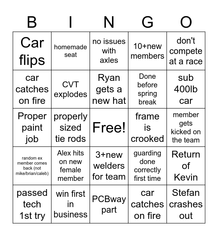 This bingo card has a free space and 24 words: Alex hits on new female member, win first in business, Ryan gets a new hat, passed tech 1st try, don't compete at a race, Car flips, car catches on fire, homemade seat, frame is crooked, 3+new welders for team, Done before spring break, Proper paint job, guarding done correctly first time, Return of Kevin, CVT explodes, car catches on fire, member gets kicked on the team, no issues with axles, sub 400lb car, properly sized tie rods, Stefan crashes out, random ex member comes back (not mike/brian/caleb), 10+new members and PCBway part.
