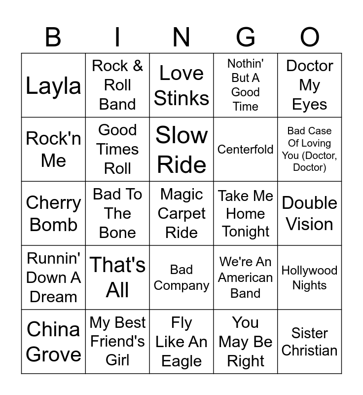 This bingo card has 54 words: Free!, Runnin' Down A Dream, Don't Stop, Under Pressure, Bad Company, When I Come Around, Nothin' But A Good Time, Just What I Needed, Rock'n Me, Life's Been Good, Layla, Hot Blooded, My Best Friend's Girl, China Grove, Listen to the Music, Fly Like An Eagle, Magic Carpet Ride, Centerfold, All Right Now, Double Vision, We're An American Band, It's Still Rock and Roll to Me, Take Me Home Tonight, Doctor My Eyes, Small Town, Rock & Roll Band, My Sharona, Lido Shuffle, Caught Up In You, You May Be Right, Jessie's Girl, Roll On Down The Highway, Everybody Wants You, What's Your Name, Love Stinks, Working for the Weekend, Cherry Bomb, Hollywood Nights, Sister Christian, Good Times Roll, Running on Empty, Shooting Star, Jungle Love, Heartache Tonight, That's All, Magic Man, Fox On The Run, Lovin', Touchin', Squeezin', Slow Ride, Bad To The Bone, Bad Case Of Loving You (Doctor, Doctor), I Hate Myself for Loving You, Breakdown and Heartbreaker.