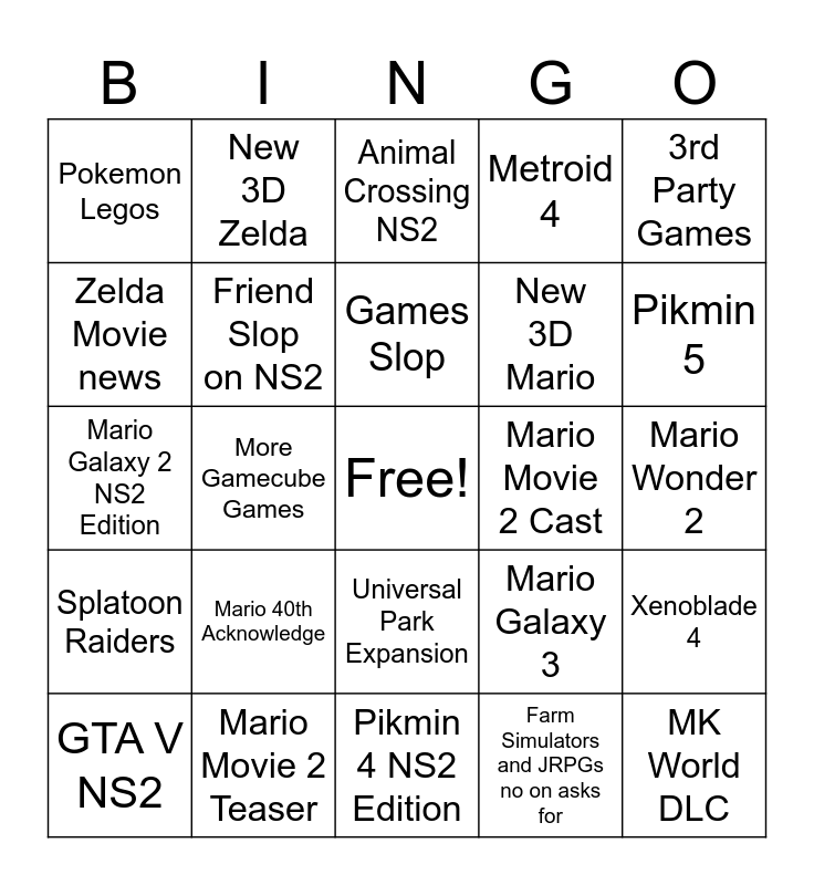 This bingo card has a free space and 24 words: Mario 40th Acknowledge, Mario Movie 2 Teaser, Games Slop, GTA V NS2, 3rd Party Games, Pokemon Legos, Zelda Movie news, New 3D Zelda, Mario Movie 2 Cast, Universal Park Expansion, New 3D Mario, Mario Galaxy 2 NS2 Edition, Mario Galaxy 3, Xenoblade 4, Friend Slop on NS2, Farm Simulators and JRPGs no on asks for, Mario Wonder 2, Animal Crossing NS2, Pikmin 5, More Gamecube Games, MK World DLC, Splatoon Raiders, Metroid 4 and Pikmin 4 NS2 Edition.