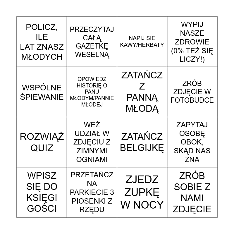 This bingo card has 21 words: PRZETAŃCZ NA PARKIECIE 3 PIOSENKI Z RZĘDU, WEŹ UDZIAŁ W OCZEPINACH, PRZECZYTAJ CAŁĄ GAZETKĘ WESELNĄ, ZATAŃCZ Z NIEZNAJOMYM - DUŻO OSÓB UMIE TU TAŃCZYĆ! :), ZJEDZ ZUPKĘ W NOCY, ZATAŃCZ Z PANNĄ MŁODĄ, POLICZ, ILE LAT ZNASZ MŁODYCH, NAPIJ SIĘ KAWY/HERBATY, ZATAŃCZ BELGIJKĘ, ZRÓB ZDJĘCIE W FOTOBUDCE, ROZWIĄŻ QUIZ, WYPIJ NASZE ZDROWIE (0% TEŻ SIĘ LICZY!), ZRÓB SOBIE Z NAMI ZDJĘCIE, DOŁĄCZ DO POCIĄGU, OPOWIEDZ HISTORIĘ O PANU MŁODYM/PANNIE MŁODEJ, STWIERDŹ, ŻE TORT DOBRY - TAKI NIE ZA SŁODKI, WPISZ SIĘ DO KSIĘGI GOŚCI, WEŹ UDZIAŁ W ZDJĘCIU Z ZIMNYMI OGNIAMI, WSPÓLNE ŚPIEWANIE, ZAPYTAJ OSOBĘ OBOK, SKĄD NAS ZNA and BAW SIĘ DOBRZE.