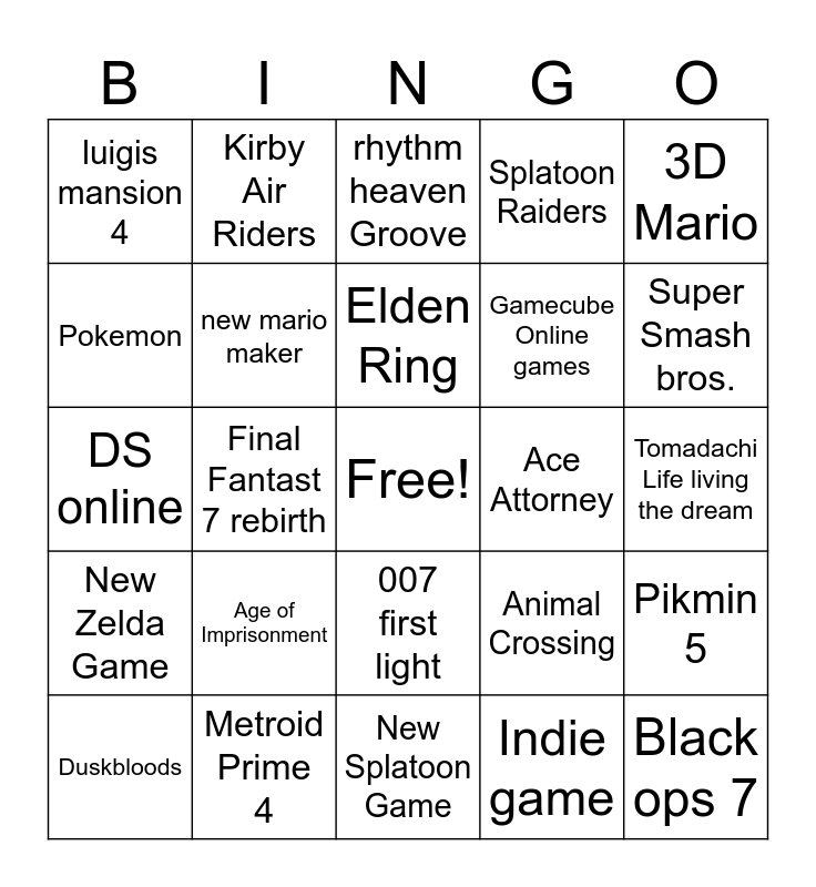 This bingo card has a free space and 24 words: Age of Imprisonment, Metroid Prime 4, Elden Ring, Duskbloods, 3D Mario, luigis mansion 4, Pokemon, Kirby Air Riders, Ace Attorney, 007 first light, Gamecube Online games, DS online, Animal Crossing, Pikmin 5, new mario maker, Indie game, Tomadachi Life living the dream, rhythm heaven Groove, Super Smash bros., Final Fantast 7 rebirth, Black ops 7, New Zelda Game, Splatoon Raiders and New Splatoon Game.