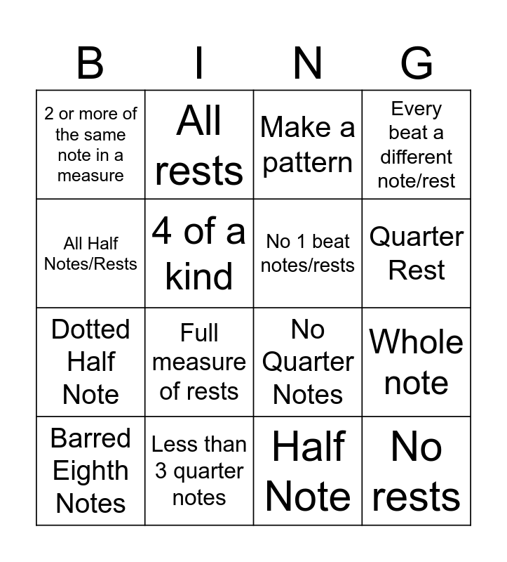This bingo card has 16 words: Less than 3 quarter notes, Whole note, Make a pattern, 2 or more of the same note in a measure, Dotted Half Note, All rests, No Quarter Notes, Half Note, All Half Notes/Rests, 4 of a kind, Barred Eighth Notes, Every beat a different note/rest, Full measure of rests, Quarter Rest, No 1 beat notes/rests and No rests.