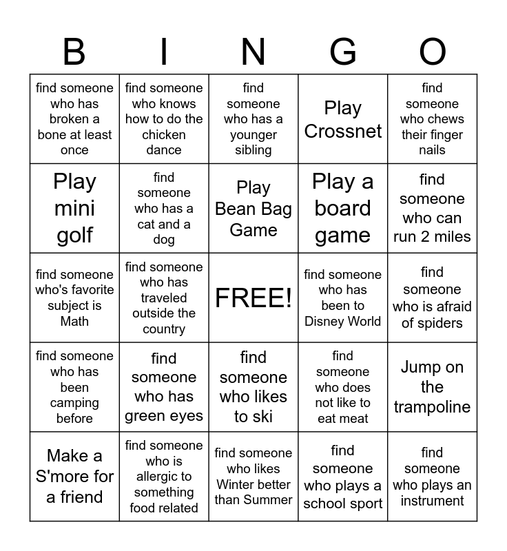 This bingo card has a free space and 30 words: find someone who is allergic to something food related, find someone who has a birthday in July, find someone who has traveled outside the country, find someone who has never been on an airplane, find someone who has broken a bone at least once, find someone who has a younger sibling, find someone who has a cat and a dog, find someone who likes to ski, find someone who has been to Disney World, find someone who likes Winter better than Summer, find someone who is afraid of spiders, find someone who plays an instrument, find someone who plays a school sport, find someone who has seen a Broadway play, find someone who can run 2 miles, find someone who is wearing earrings, find someone who does not like to eat meat, find someone who has been camping before, find someone who has green eyes, find someone who chews their finger nails, find someone who's favorite subject is Math, find someone who likes to speak in public, find someone who knows how to do the chicken dance, Play a board game, Play mini golf, Play Crossnet, Jump on the trampoline, Make a S'more for a friend, Play Bean Bag Game and Sing a Song.