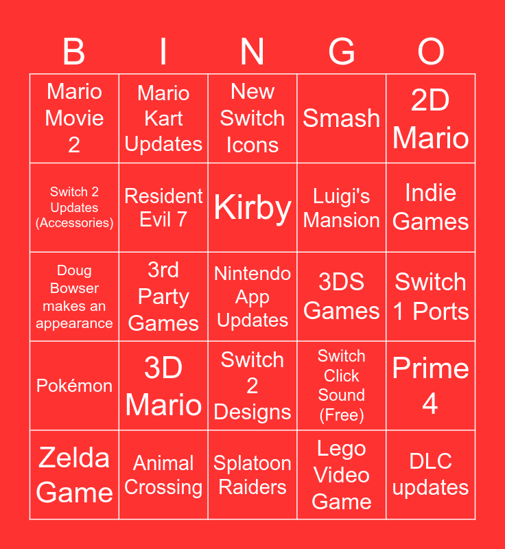 This bingo card has 25 words: 3D Mario, Splatoon Raiders, Kirby, Zelda Game, 2D Mario, Mario Movie 2, Switch 2 Updates (Accessories), Mario Kart Updates, 3DS Games, Switch 2 Designs, Luigi's Mansion, Doug Bowser makes an appearance, Switch Click Sound (Free), Prime 4, Resident Evil 7, DLC updates, Switch 1 Ports, New Switch Icons, Indie Games, 3rd Party Games, Nintendo App Updates, Animal Crossing, Pokémon, Smash and Lego Video Game.
