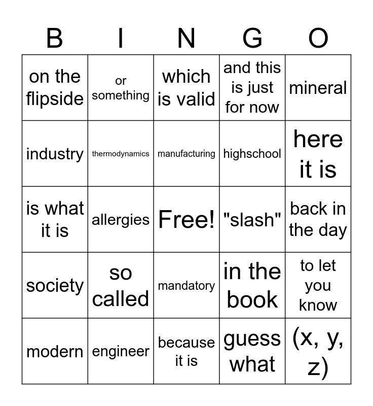 This bingo card has a free space and 24 words: so called, engineer, manufacturing, modern, mineral, on the flipside, industry, or something, "slash", mandatory, highschool, is what it is, in the book, to let you know, thermodynamics, guess what, back in the day, which is valid, here it is, allergies, (x, y, z), society, and this is just for now and because it is.