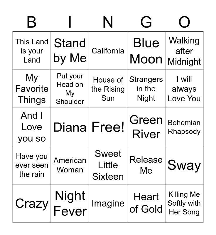 This bingo card has a free space and 24 words: American Woman, Night Fever, House of the Rising Sun, Crazy, Walking after Midnight, This Land is your Land, My Favorite Things, Stand by Me, Green River, Sweet Little Sixteen, Strangers in the Night, And I Love you so, Release Me, Sway, Put your Head on My Shoulder, Heart of Gold, Bohemian Rhapsody, California, I will always Love You, Diana, Killing Me Softly with Her Song, Have you ever seen the rain, Blue Moon and Imagine.