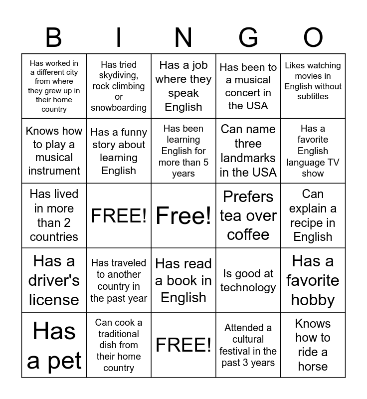 This bingo card has a free space and 24 words: Has traveled to another country in the past year, Can cook a traditional dish from their home country, Has been learning English for more than 5 years, Has a pet, Likes watching movies in English without subtitles, Has worked in a different city from where they grew up in their home country, Knows how to play a musical instrument, Has tried skydiving, rock climbing or snowboarding, Prefers tea over coffee, Has read a book in English, Can name three landmarks in the USA, Has lived in more than 2 countries, Is good at technology, Has a favorite hobby, Has a funny story about learning English, Attended a cultural festival in the past 3 years, Can explain a recipe in English, Has a job where they speak English, Has a favorite English language TV show, FREE!, Knows how to ride a horse, Has a driver's license, Has been to a musical concert in the USA and FREE!.