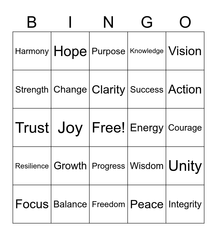 This bingo card has a free space and 24 words: Growth, Balance, Clarity, Focus, Vision, Harmony, Strength, Hope, Energy, Progress, Success, Trust, Wisdom, Unity, Change, Peace, Courage, Purpose, Action, Joy, Integrity, Resilience, Knowledge and Freedom.