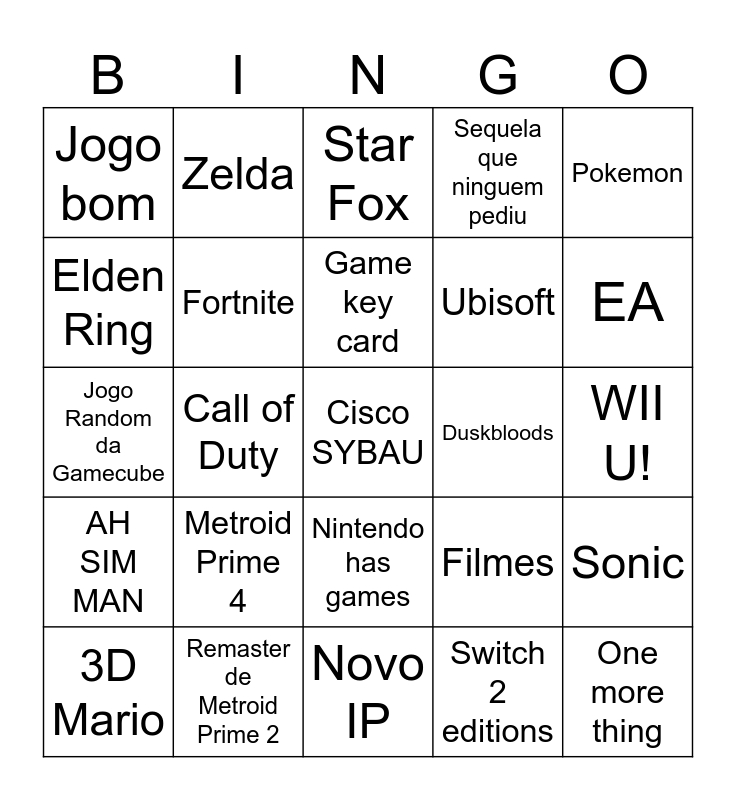This bingo card has a free space and 24 words: Metroid Prime 4, Remaster de Metroid Prime 2, Game key card, 3D Mario, Pokemon, Jogo bom, Elden Ring, Zelda, Duskbloods, Nintendo has games, Ubisoft, Jogo Random da Gamecube, Filmes, Sonic, Fortnite, Switch 2 editions, WII U!, Star Fox, EA, Call of Duty, One more thing, AH SIM MAN, Sequela que ninguem pediu and Novo IP.