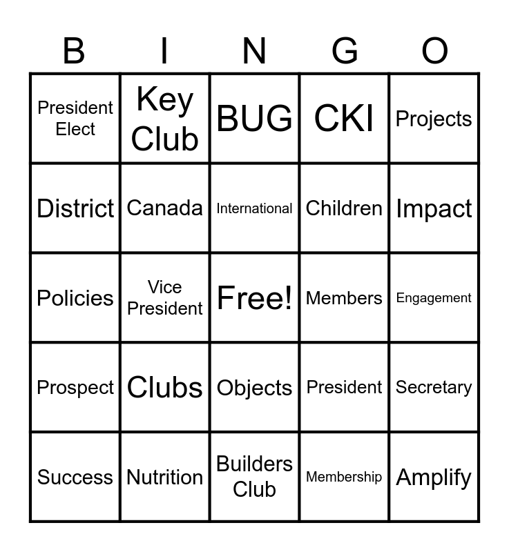 This bingo card has a free space and 49 words: Kiwanis, Amplify, KKids, Builders Club, Clubs, EC&C, Key Club, Lieutenant Governor, District, Division, Canada, CKI, Secretary, President, Signature Project, Divisional Council Meeting, International, Members, SLP, Projects, Vice President, Membership, President Elect, Children, Community, Impact, Success, Vision, Objects, Prospect, Leaders, Aktion, Goals, Education, Nutrition, Background, Dues, Improve, Engagement, Two for Two, Schools, Fellowship, Training, Club Leadership, Policies, BUG, Interclubbing, Dashboard and Monthly Reports.