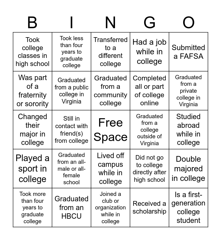 This bingo card has a free space and 24 words: Graduated from an all-male or all-female school, Graduated from an HBCU, Graduated from a community college, Took more than four years to graduate college, Submitted a FAFSA, Took college classes in high school, Was part of a fraternity or sorority, Took less than four years to graduate college, Graduated from a college outside of Virginia, Lived off campus while in college, Completed all or part of college online, Changed their major in college, Did not go to college directly after high school, Double majored in college, Graduated from a public college in Virginia, Received a scholarship, Studied abroad while in college, Transferred to a different college, Graduated from a private college in Virginia, Still in contact with friend(s) from college, Is a first-generation college student, Played a sport in college, Had a job while in college and Joined a club or organization while in college.