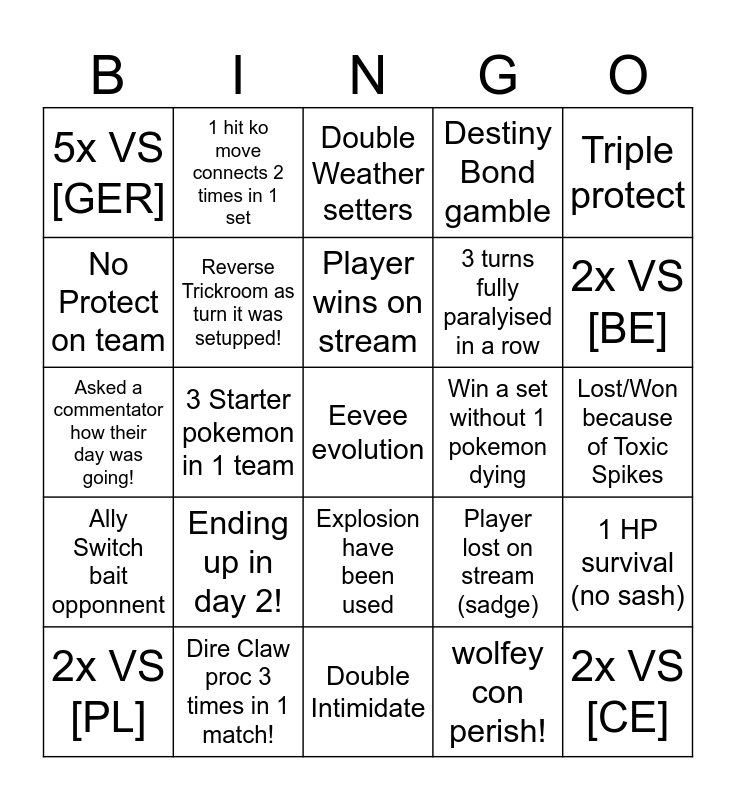 This bingo card has a free space and 24 words: Ending up in day 2!, Dire Claw proc 3 times in 1 match!, Player wins on stream, 2x VS [PL], Triple protect, 5x VS [GER], No Protect on team, 1 hit ko move connects 2 times in 1 set, Win a set without 1 pokemon dying, Explosion have been used, 3 turns fully paralyised in a row, Asked a commentator how their day was going!, Player lost on stream (sadge), 1 HP survival (no sash), Reverse Trickroom as turn it was setupped!, wolfey con perish!, Lost/Won because of Toxic Spikes, Double Weather setters, 2x VS [BE], 3 Starter pokemon in 1 team, 2x VS [CE], Ally Switch bait opponnent, Destiny Bond gamble and Double Intimidate.