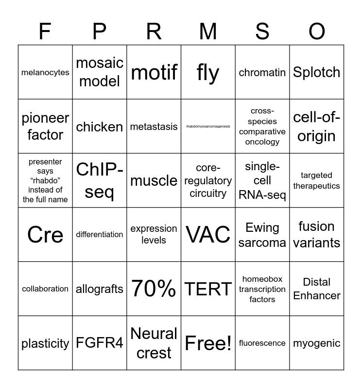 This bingo card has 41 words: Free!, cross-species comparative oncology, short-tail, pioneer factor, VAC, targeted therapeutics, chicken, 1993, chromatin, core-regulatory circuitry, cell-of-origin, fly, presenter says “rhabdo” instead of the full name, muscle, ChIP-seq, single-cell RNA-seq, plasticity, melanocytes, fluorescence, motif, differentiation, collaboration, Ewing sarcoma, metastasis, myogenic, homeobox transcription factors, fusion variants, translocation, rhabdomyosarcomagenesis, allografts, VGLL2::NCOA2, mosaic model, expression levels, FGFR4, Cre, Splotch, 70%, Distal Enhancer, Neural crest, TERT and Precision medicine.