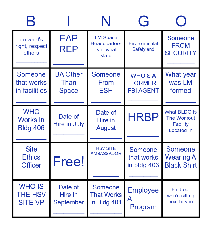 This bingo card has 25 words: Free!, Someone That Works In Bldg 401 _________, Someone From ESH ________, WHO IS THE HSV SITE VP ________, Someone FROM SECURITY ________, do what’s right, respect others __________, Someone that works in facilities ________, EAP REP ______, HRBP _____, HSV SITE AMBASSADOR ___________, WHO’S A FORMER FBI AGENT _________, WHO Works In Bldg 406 ________, Someone that works in bldg 403 ________, Someone Wearing A Black Shirt ________, BA Other Than Space ________, Find out who's sitting next to you ___________, What BLDG Is The Workout Facility Located In ___________, LM Space Headquarters is in what state ___________, What year was LM formed ________, Date of Hire in July _________, Date of Hire in August _________, Date of Hire in September _________, Site Ethics Officer ________, Environmental Safety and ____________ and Employee A_______ Program.