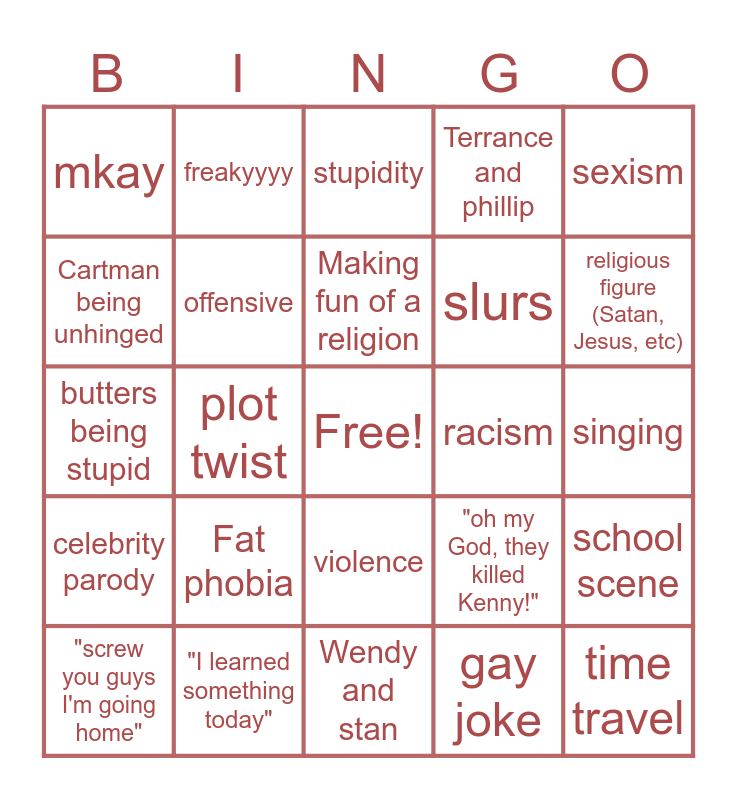 This bingo card has a free space and 24 words: Fat phobia, "I learned something today", Making fun of a religion, "screw you guys I'm going home", sexism, mkay, Cartman being unhinged, freakyyyy, racism, violence, slurs, butters being stupid, "oh my God, they killed Kenny!", school scene, offensive, gay joke, singing, stupidity, religious figure (Satan, Jesus, etc), plot twist, time travel, celebrity parody, Terrance and phillip and Wendy and stan.